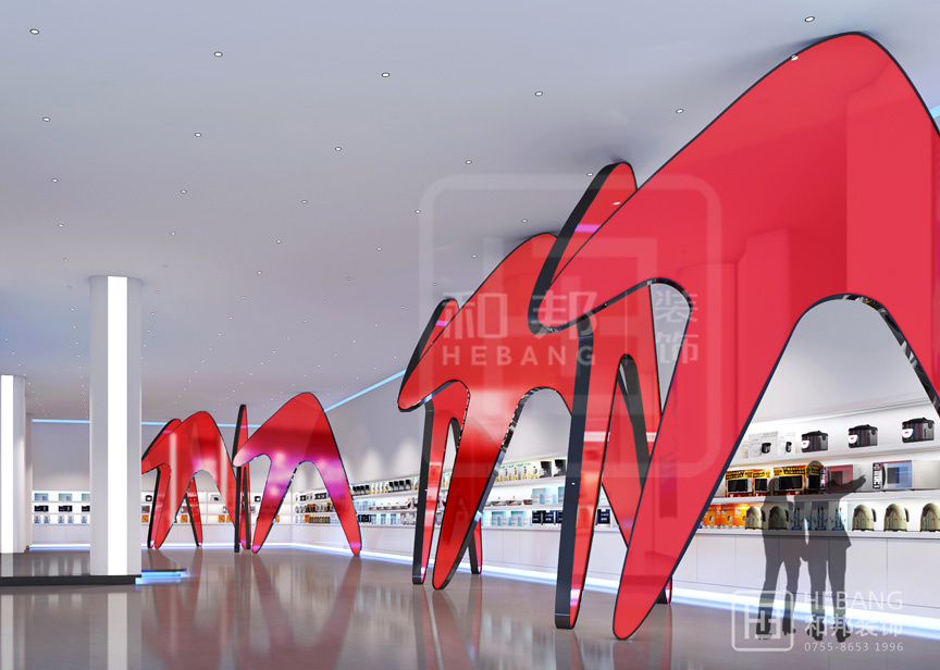 格力集團展廳主體顏色為“中國紅”,整個設計現代感十足。不管是門頭設計采用的立體設計還是內部的各種裝飾元素無不富有設計感。之外,整個展廳的科技感也是十分強的。